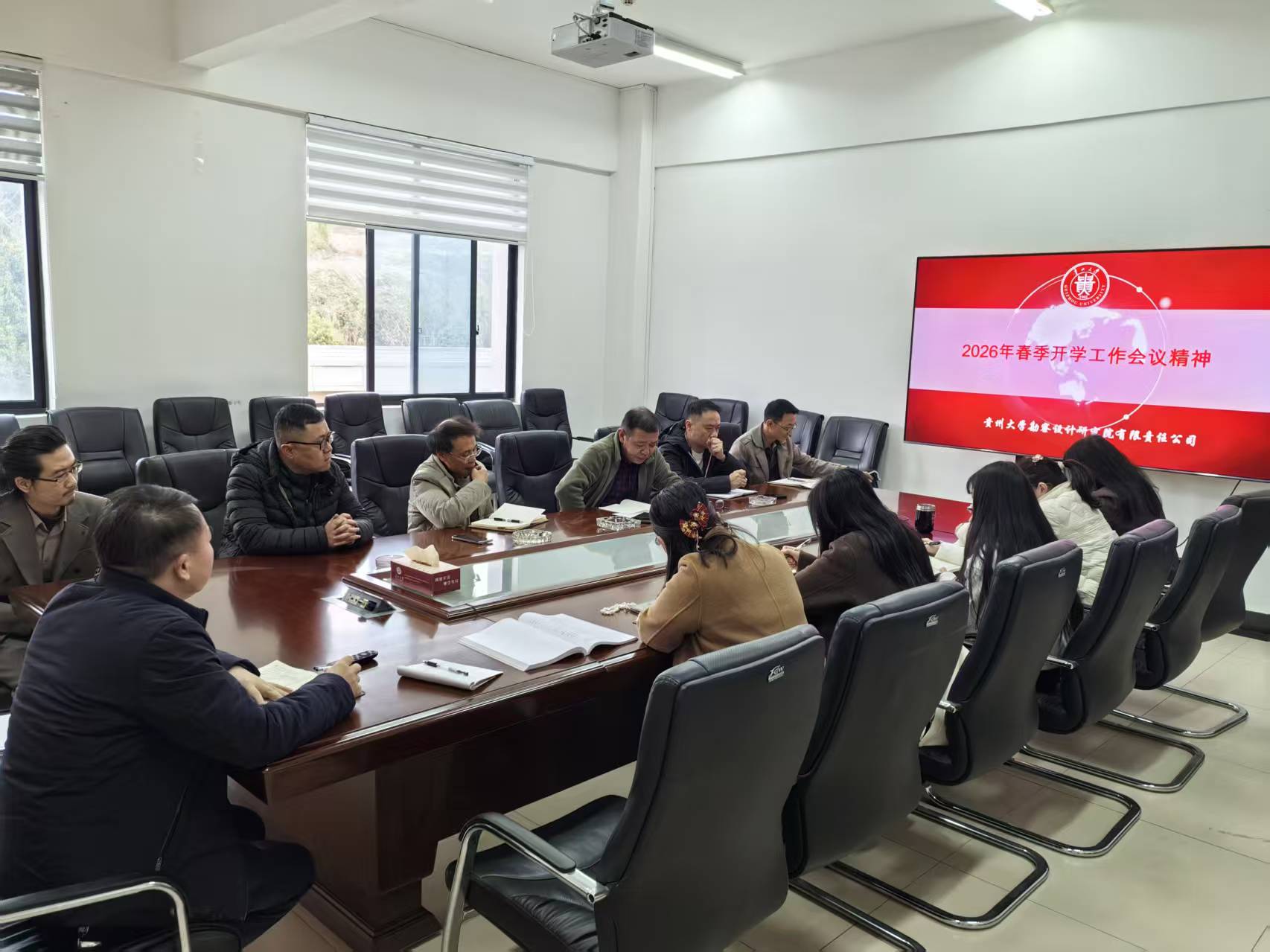为深入贯彻落实贵州大学2026年春季学期开学工作会议部署,强化全院干部职工纪律作风建设和安全意识,2026年3月2日上午10时,贵州大学勘察设计研究院在院三楼会议室召开专题会议,集中传达学习学校2026年春季开学会议精神。设计院领导班子成员、全体党员干部职工参加会议,会议由设计院院长黄勇主持。